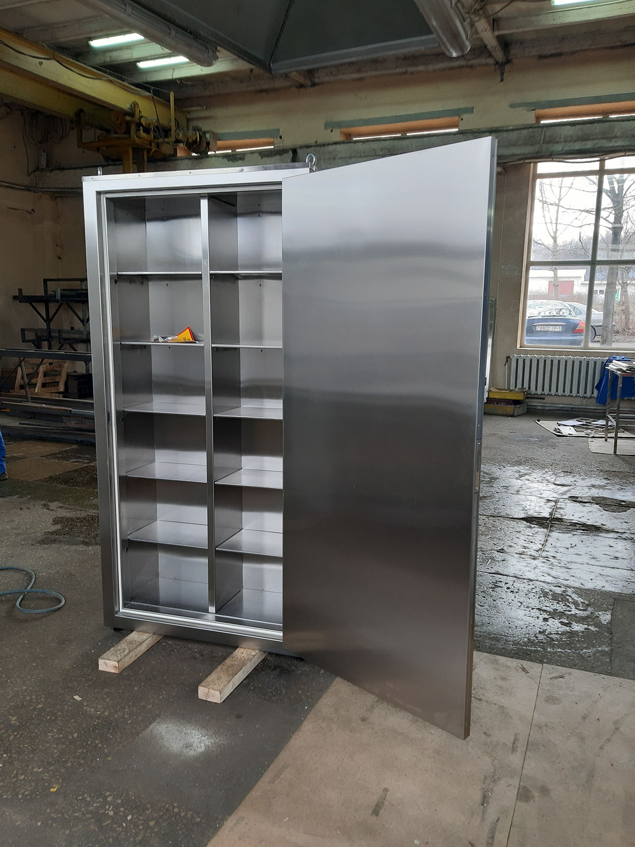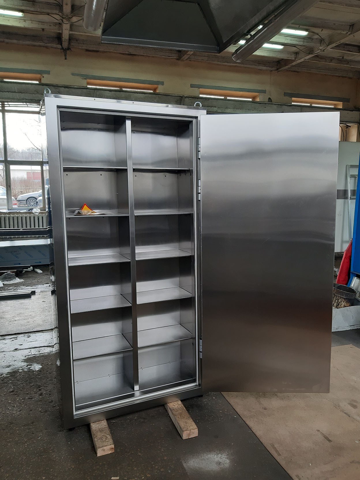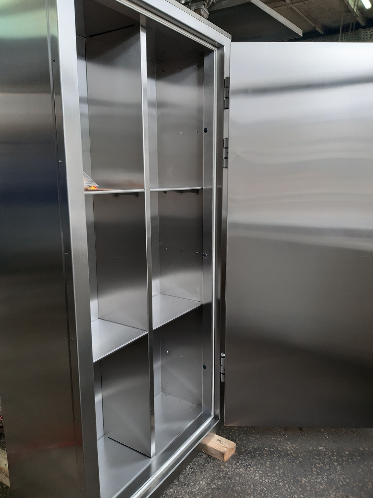 Облицовки корпуса шкафа – выполнены из нержавеющей стали марки AISI 304. Несущий каркас шкафа защитного обеспечивает долгосрочную интенсивную эксплуатацию с сохранением габаритов и геометрии конструкции. Шкаф устанавливается на четыре регулируемые опоры. Дверка шкафа оснащена запорным устройством и для удобства открывания имеет ручку-ухват из нержавеющей стали. Внутреннее пространство шкафа комплектуется полками. По желанию заказчика возможна комплектация выдвижными ящиками, сейфом. Для перемещения шкафа защитного к месту установки предусмотрены четыре съёмных рым болта.