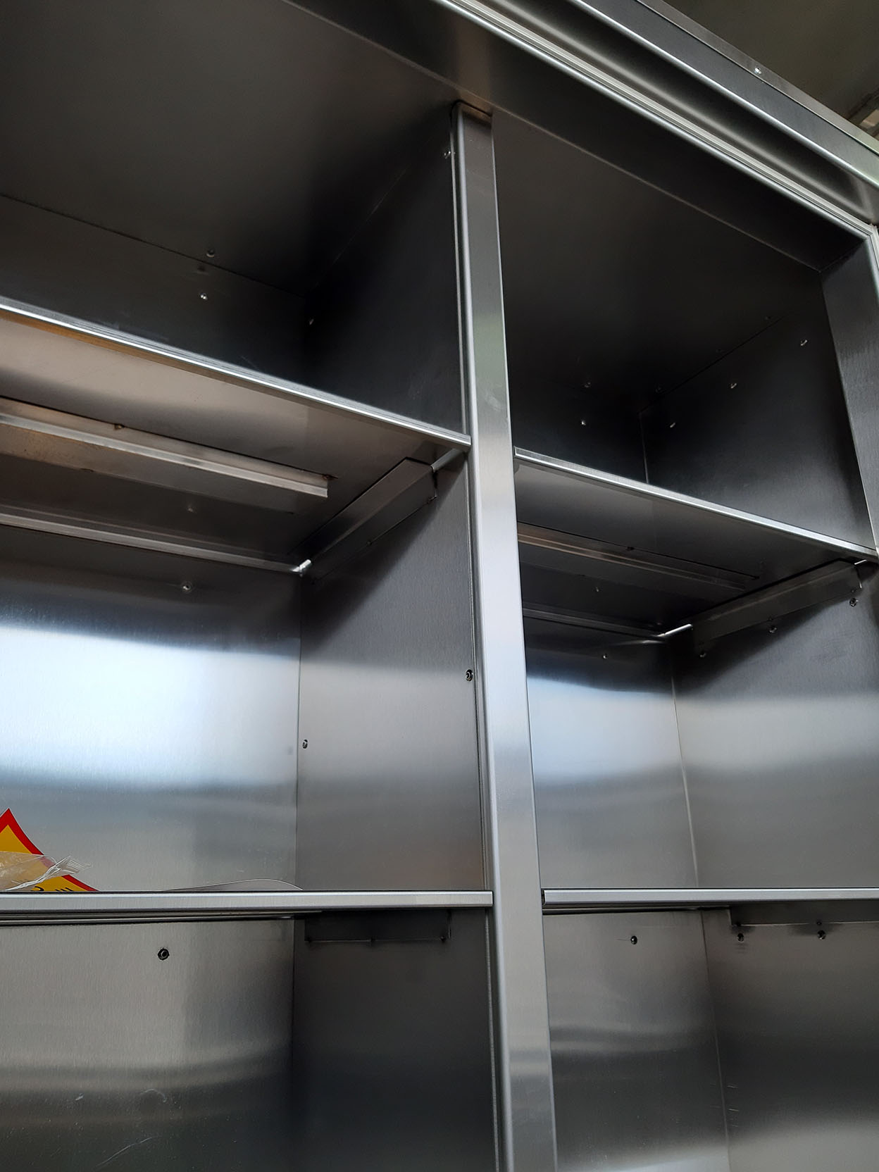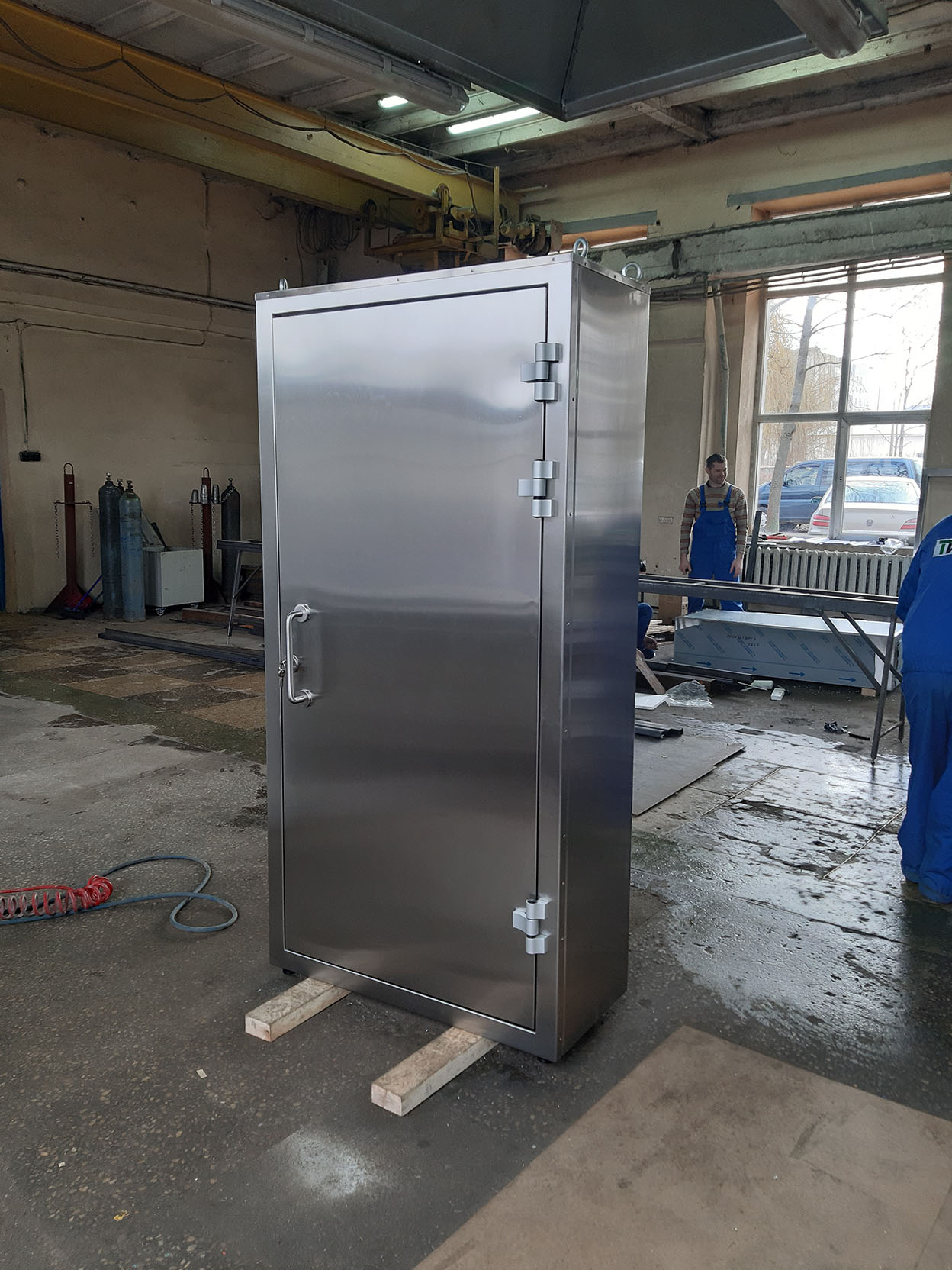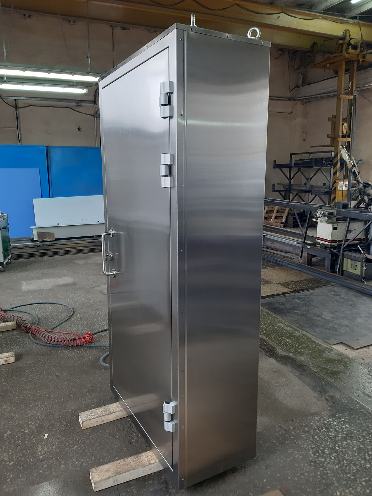 Облицовки корпуса шкафа – выполнены из нержавеющей стали марки AISI 304. Несущий каркас шкафа защитного обеспечивает долгосрочную интенсивную эксплуатацию с сохранением габаритов и геометрии конструкции. Шкаф устанавливается на четыре регулируемые опоры. Дверка шкафа оснащена запорным устройством и для удобства открывания имеет ручку-ухват из нержавеющей стали. Внутреннее пространство шкафа комплектуется полками. По желанию заказчика возможна комплектация выдвижными ящиками, сейфом. Для перемещения шкафа защитного к месту установки предусмотрены четыре съёмных рым болта.