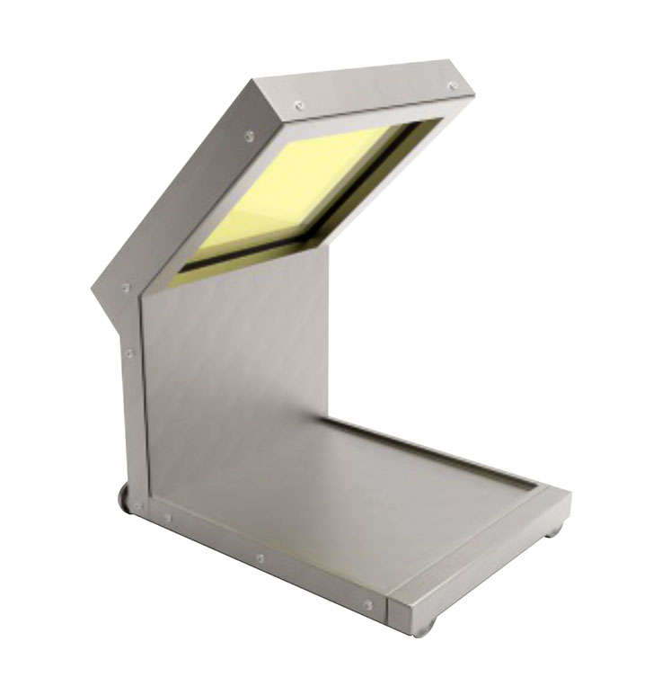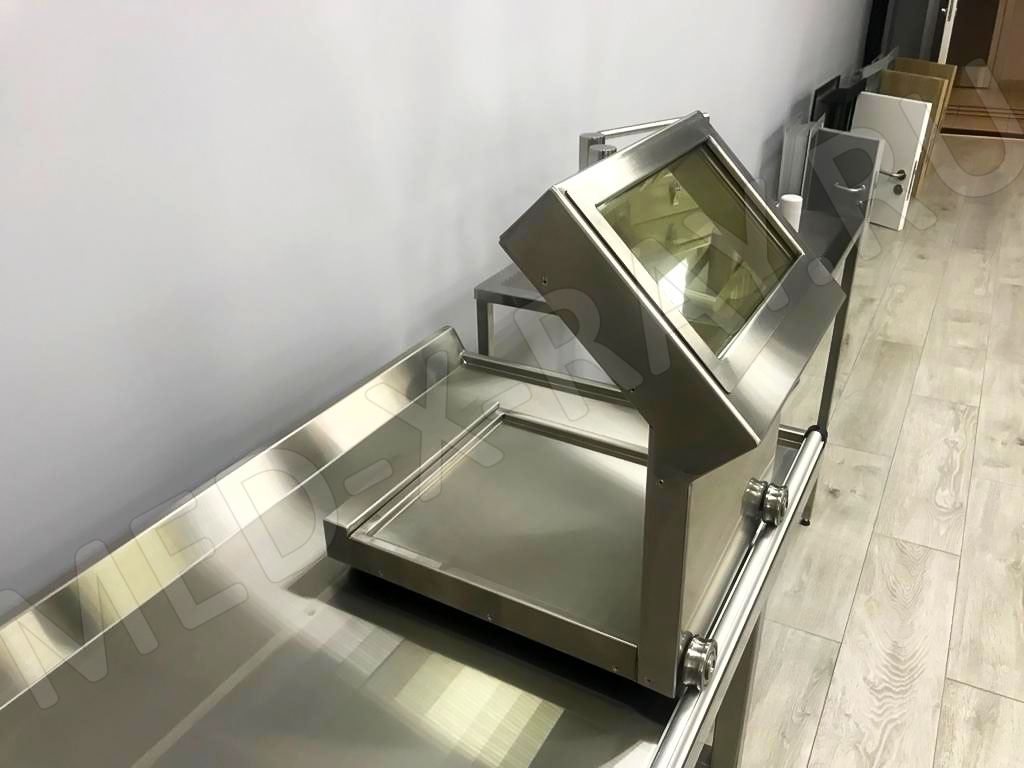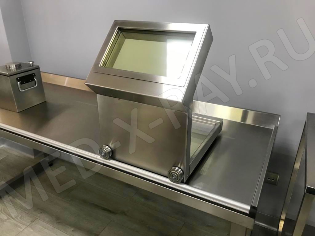 Экран защитный выполнен из нержавеющей стали. Наклонная защитная панель оснащена просвинцованным стеклом. Для удобства перемещения экрана в горизонтальной плоскости, основание имеет четыре направляющих ролика.