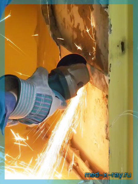 ► Как правило, сначала производится демонтаж старых рентгенозащитных дверей. В данном случае, производился демонтаж старых дверей радиологического отделения весом более 500 кг.