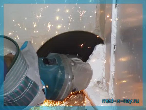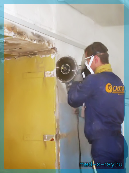 ► После работы дисковой пилой производится конечная обработка проема при помощи зубила перфоратора. Им срезаются все неровности, могущие помешать корректной установке рентгенозащитной двери в проем.