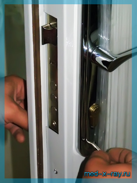 ► Вместе с тем производится монтаж замков и остальной дверной фурнитуры. В стандартном варианте изготовления рентгенозащитной двери используется замок KALE. Сам замок был вмонтирован непосредственно в полотно на заводе-изготовителе. Остается установить ручку с накладками и второй дополнительный замок, добавленный в комплектацию по желанию клиента.