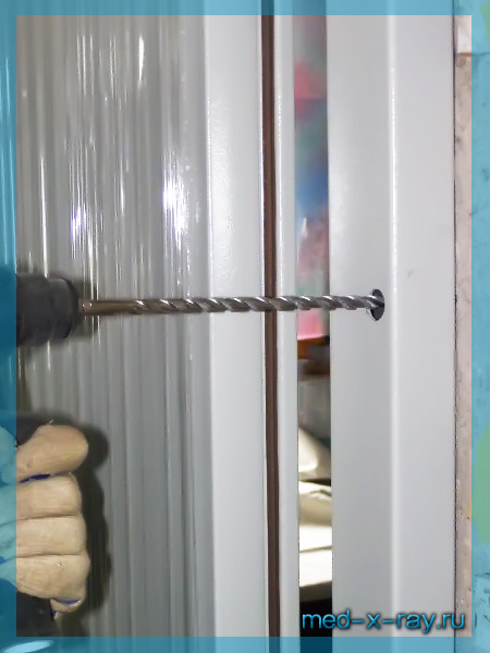 ► Через монтажные отверстия (10 мм) в коробке рентгенозащитной двери стена просверливается под удерживающие коробку монтажные дюбели. Данный способ закрепления коробки обусловлен тем, что при других способах закрепления большой вес рентгенозащитного полотна двери при эксплуатации, как правило, расшатывает конструкцию, после чего дверь выходит из строя.