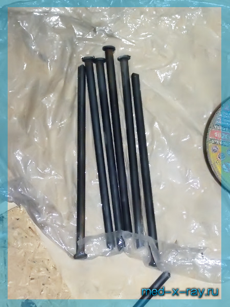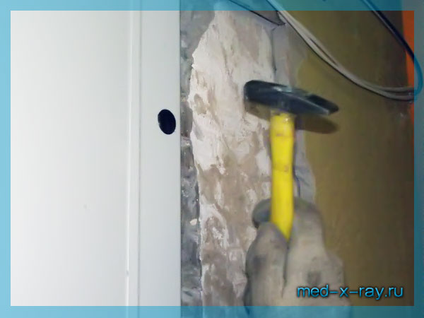 Дюбель с усилием забивается в заранее просверленное отверстие. В установленном состоянии шляпка дюбеля полностью спрятана внутри профиля коробки рентгенозащитной двери, для чего используется добойник.