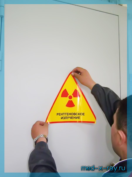► На последнем этапе на отчищенное от пыли полотно рентгенозащитной двери приклеивается знак, предупреждающий об опасности рентгеновского излучения.